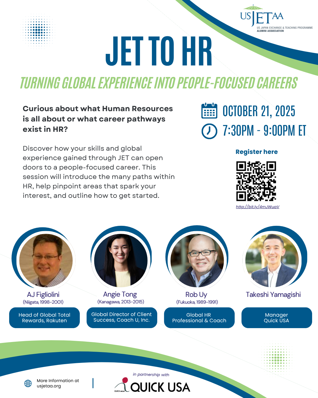 Join USJETAA and JET alumni career coaches for this free webinar that explores career opportunities in Human Resources. Learn how your JET experience can be a natural fit for this people-focused field. Don’t miss this chance to explore new career paths and connect with fellow alumni.
